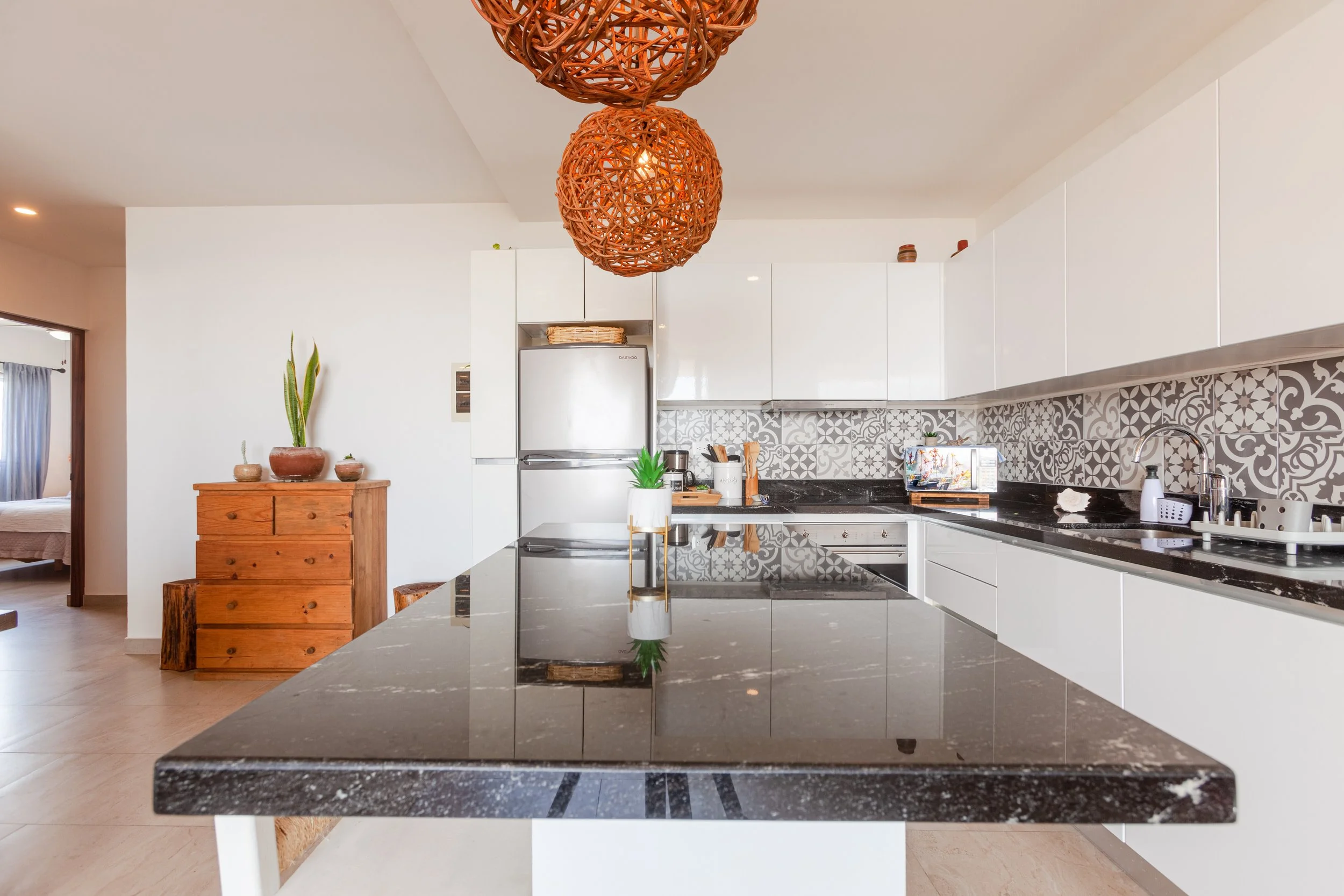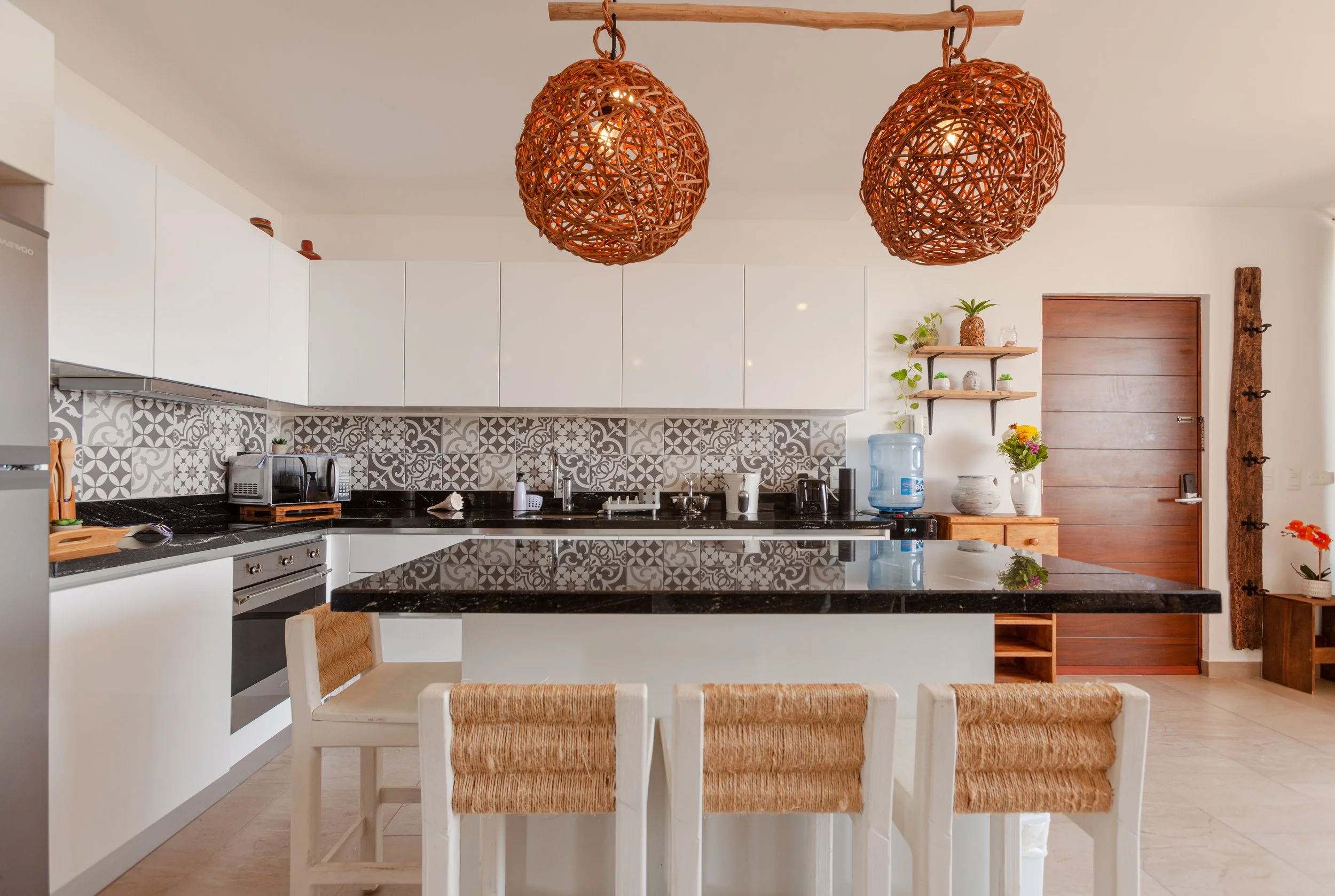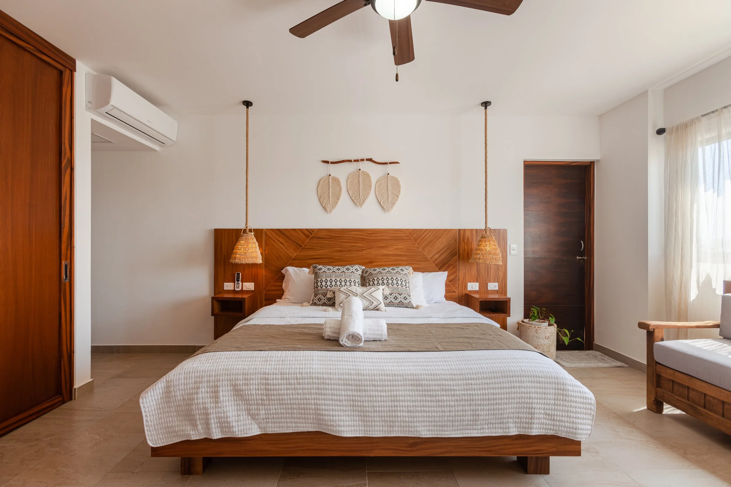 Experience unparalleled spaciousness and tranquility in this 3-bedroom, 3-bathroom haven that commands half of the top floor, shielded from street noise and no shared walls. This luxurious unit is adorned in Boho style, offering an immersive escape. Step outside to find an infinity pool at your doorstep and on the balcony for a cityscape view toward the sea that promises to leave you in a state of blissful relaxation.