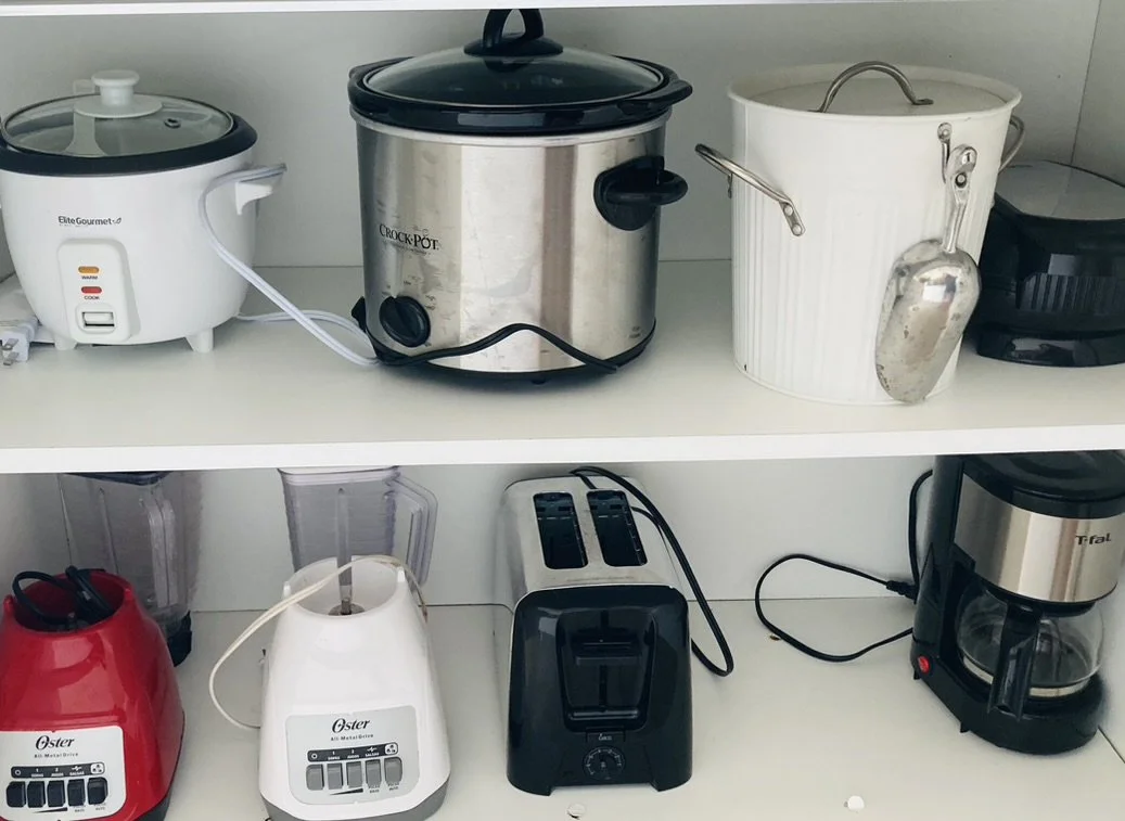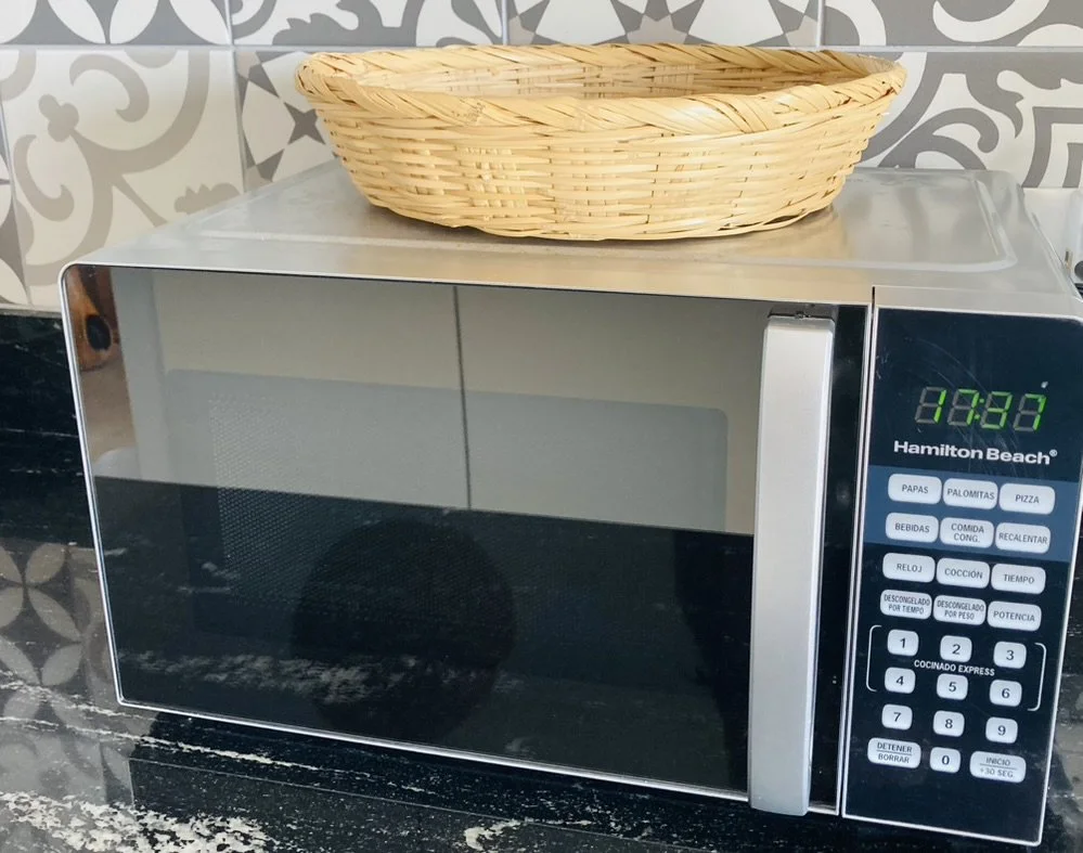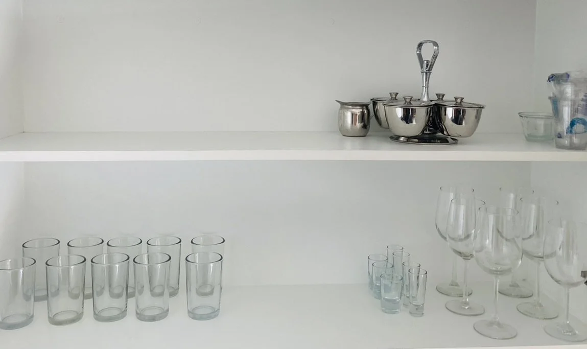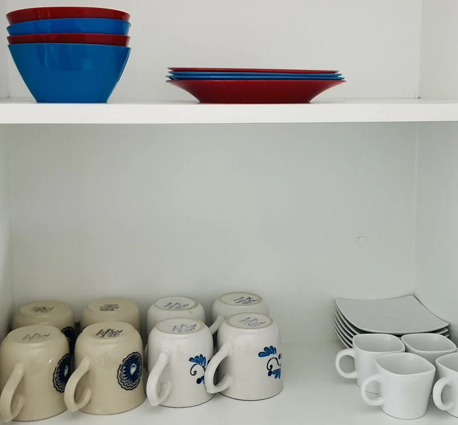 Our well-equipped apartment kitchen features a sleek SMEG electric range and oven, along with essential appliances such as a microwave, rice cooker, and crockpot. Feel free to utilize our large selection of pots and pans.