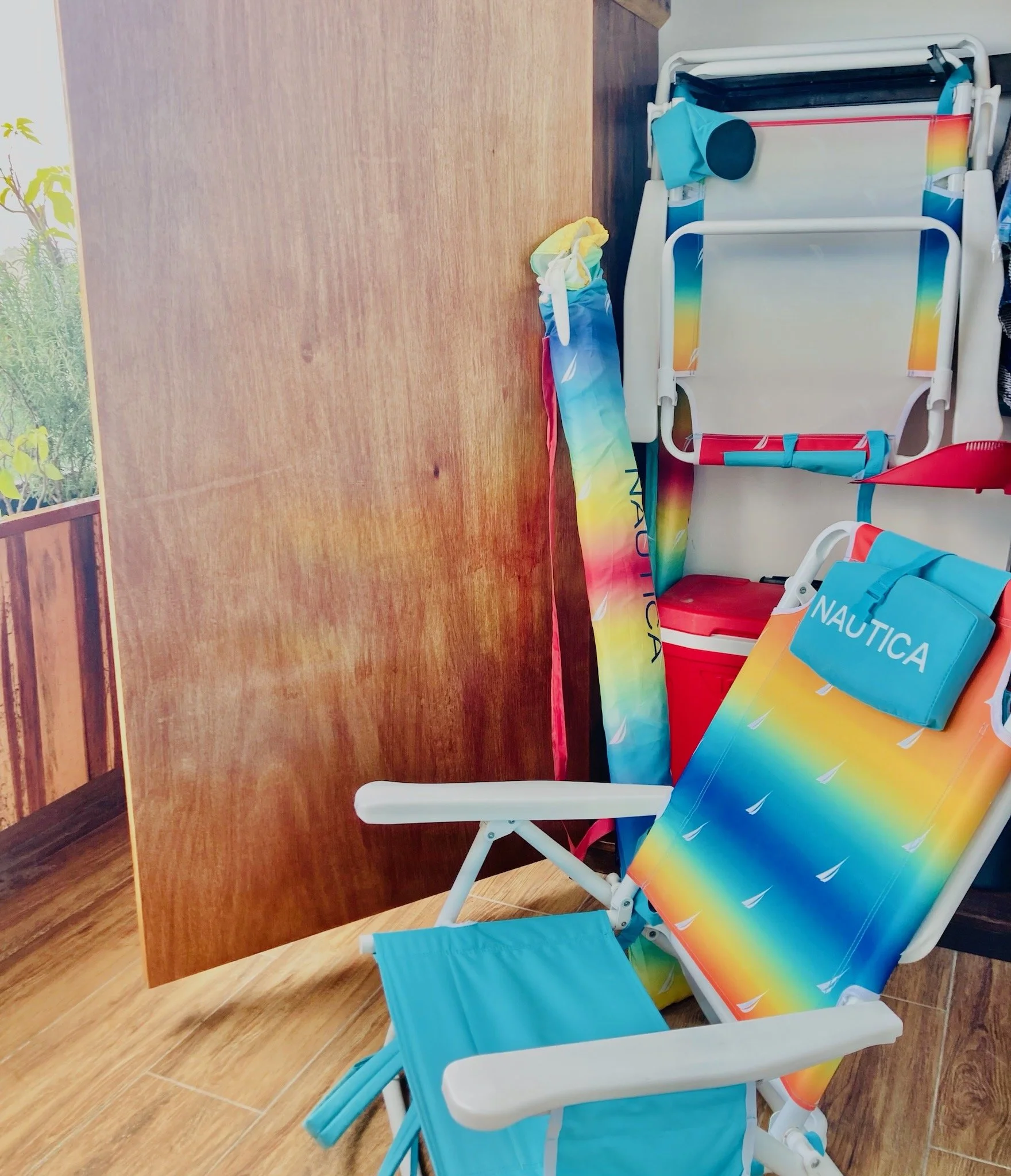 Two beach chairs, a beach umbrella and a cooler for comfort and savings.