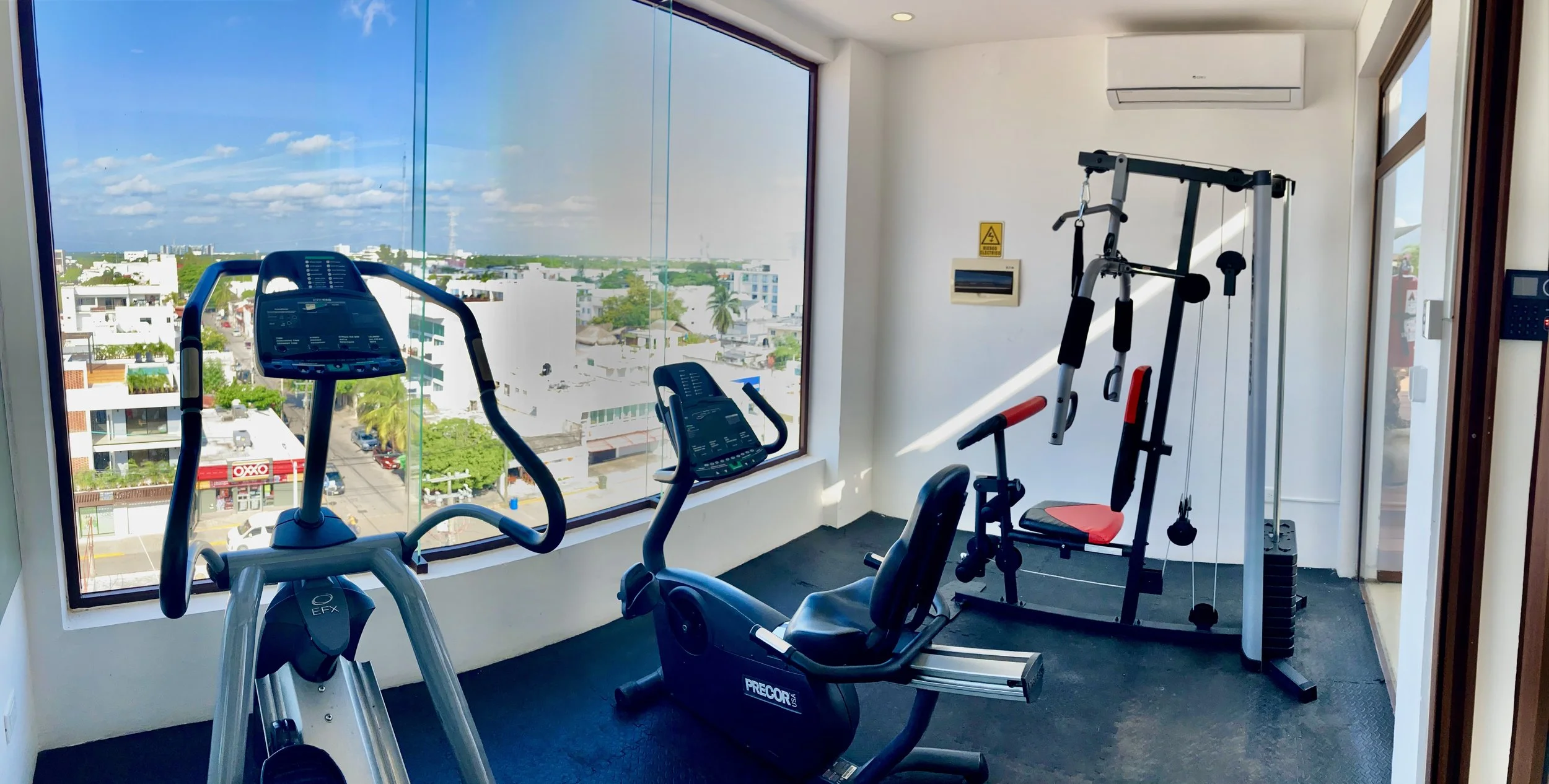 Small gym on the rooftop with a two cardio machines and an all-in-one weight machine.