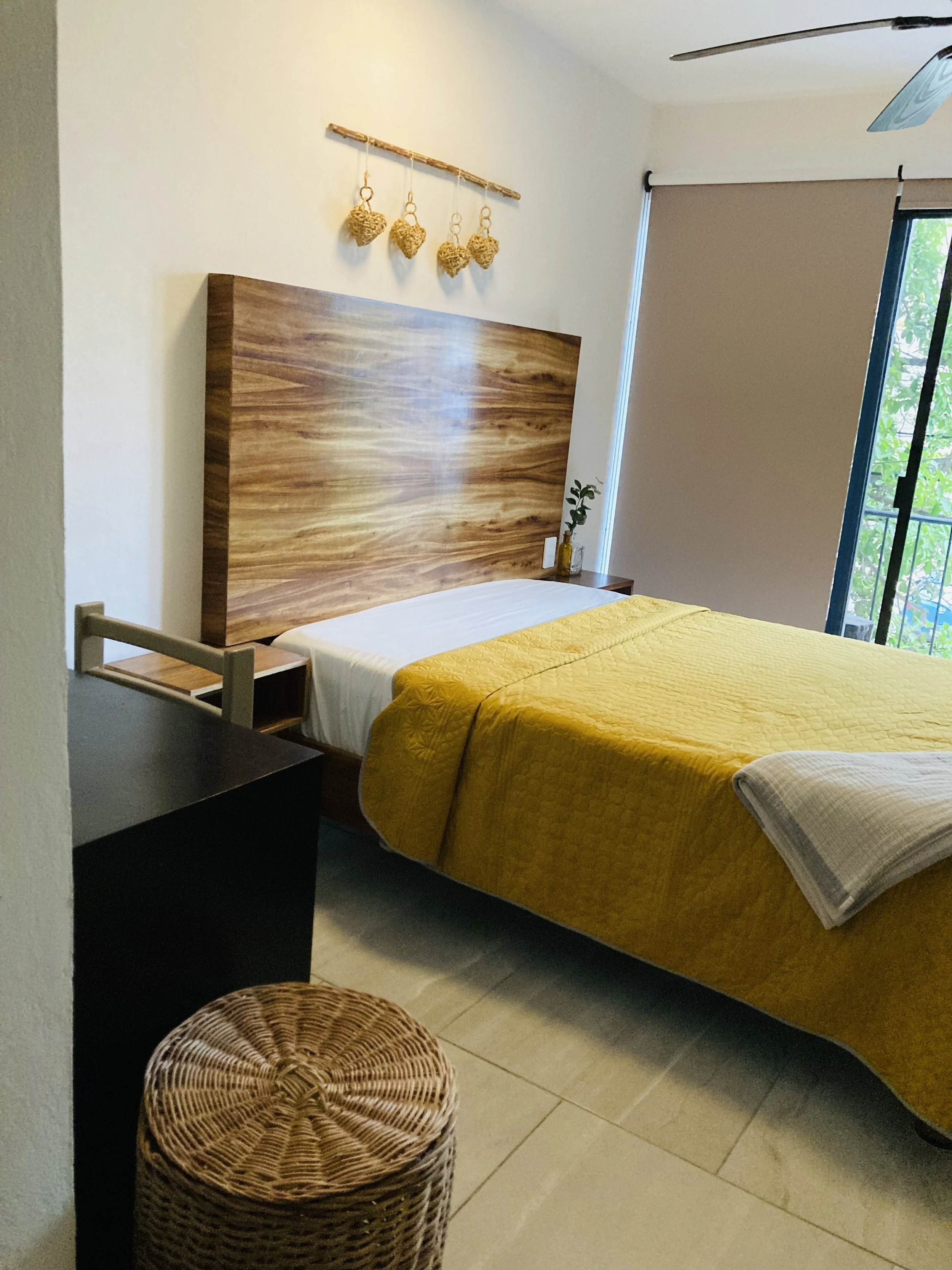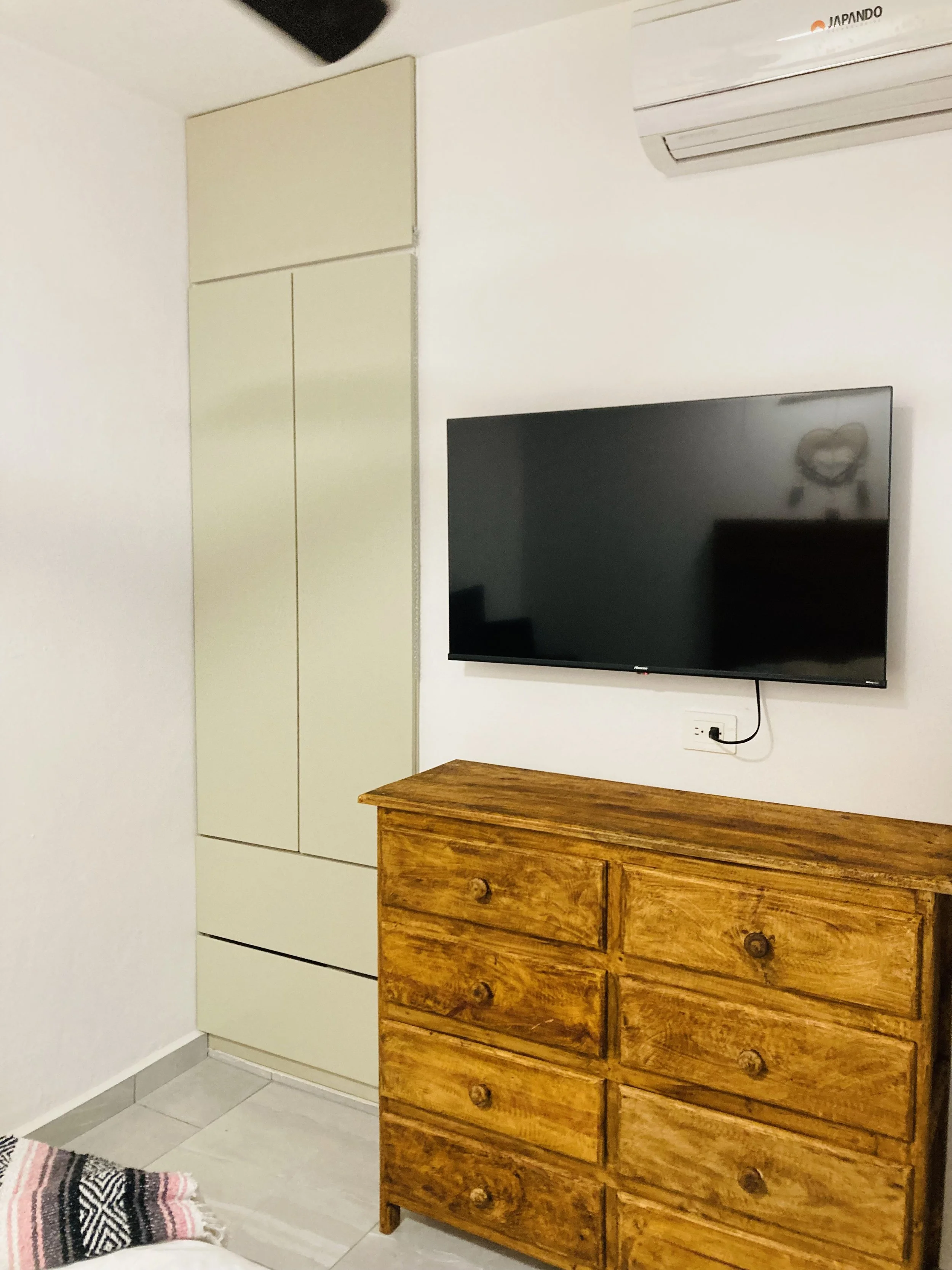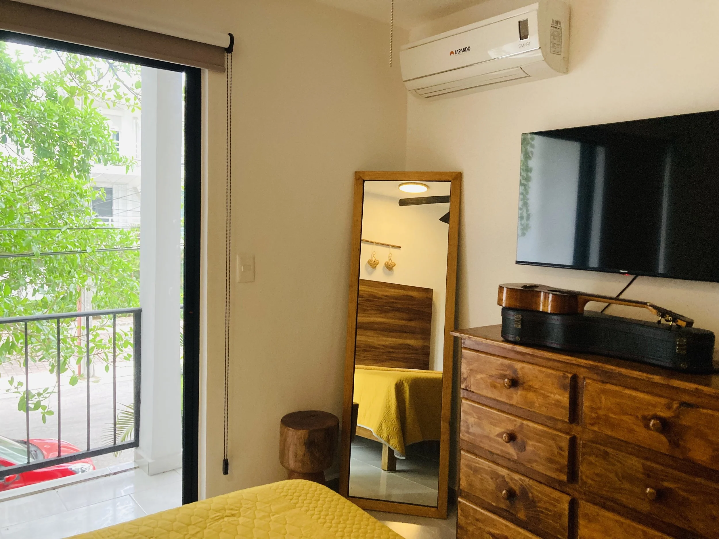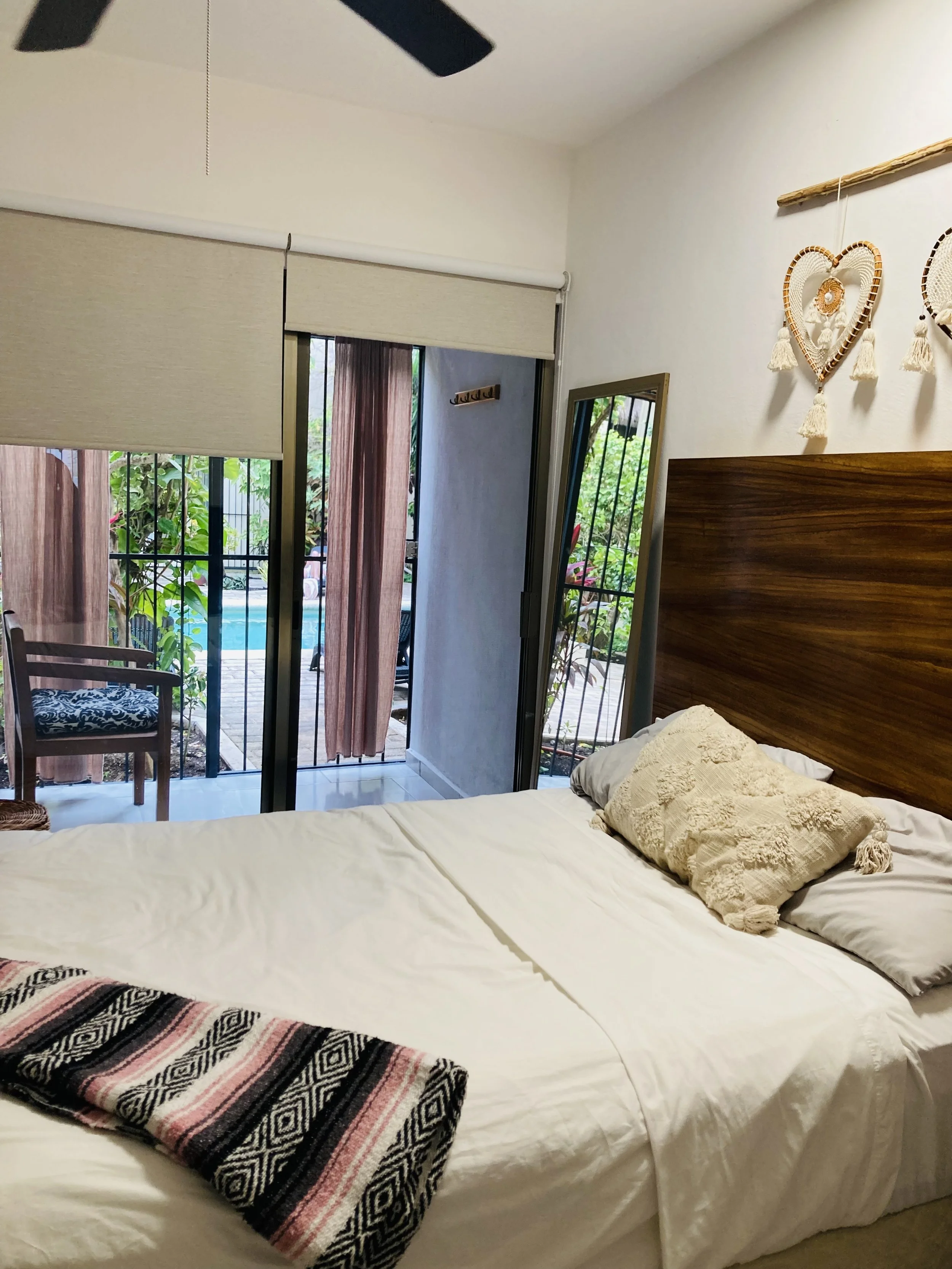 The bedroom on the ground floor opens to the common area in the courtyard, with swimming pool, palapa, shower, bathroom and lounging chairs. Both bedrooms have a desk as well as plenty of storage.