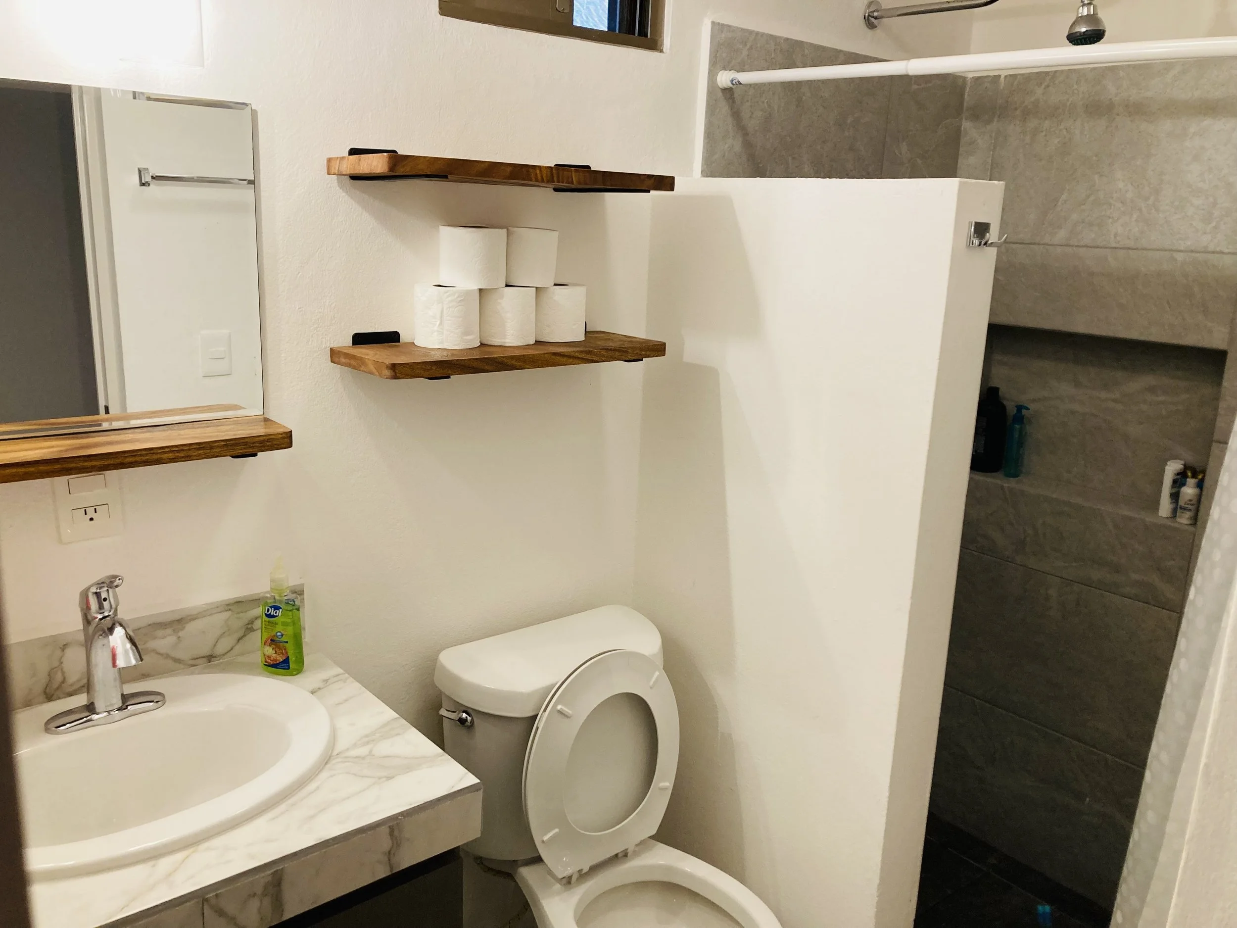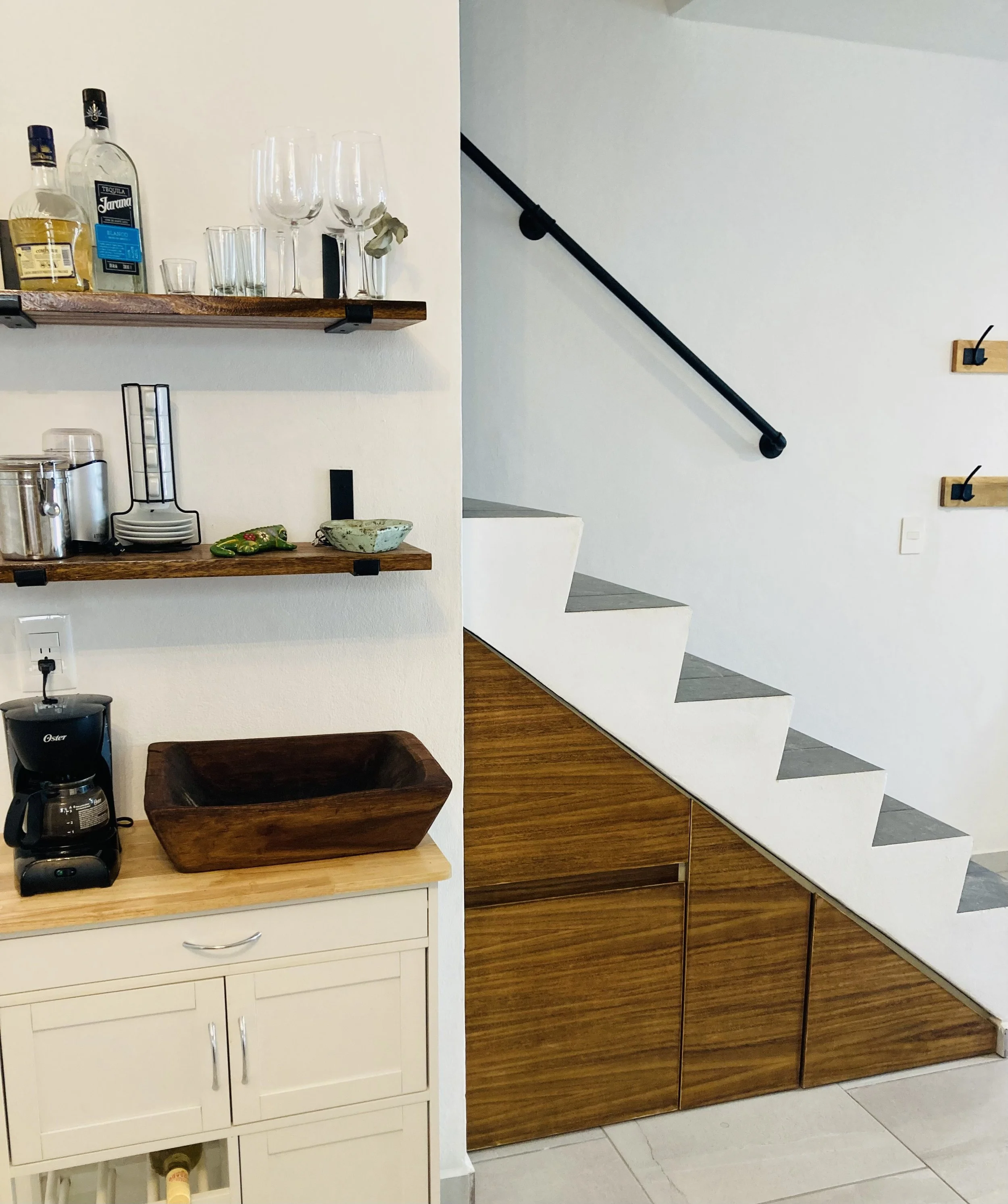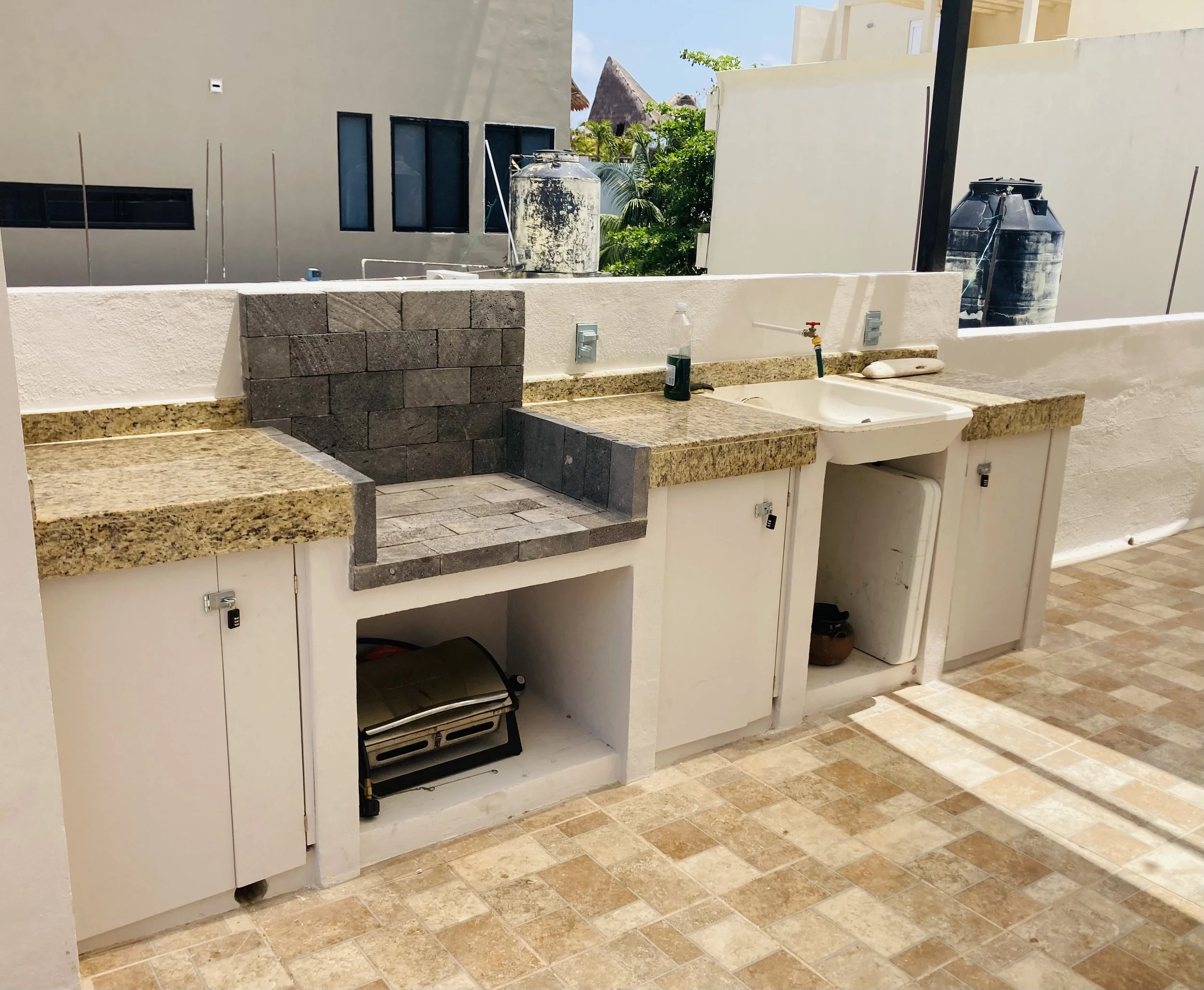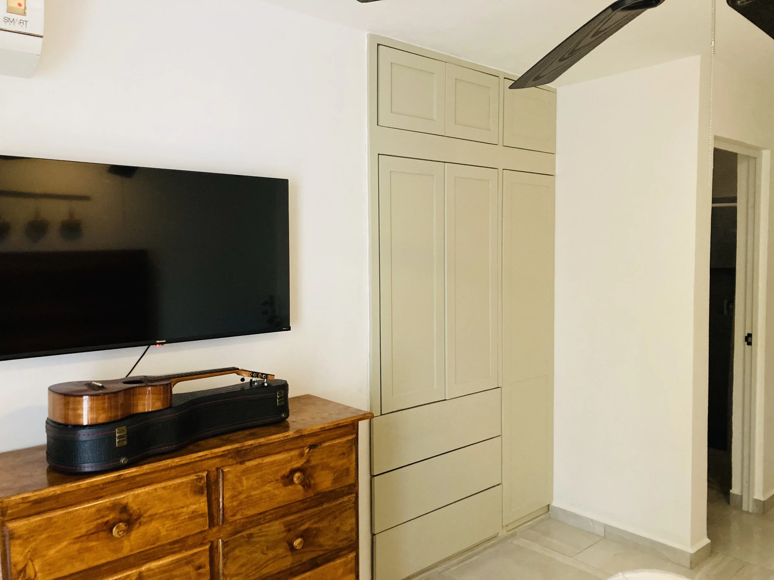 The bedroom on the ground floor opens to the common area in the courtyard, with swimming pool, palapa, shower, bathroom and lounging chairs. Both bedrooms have a desk as well as plenty of storage.